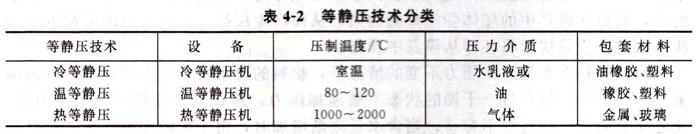 (2)等靜壓成型類型等靜壓技術(shù)按其成型和固結(jié)時溫度的高低,一般可分為三種:冷等靜壓(CIP)、溫等靜壓(WIP)和熱等靜壓(HIP)。由于等靜壓時溫度的差別,因此三種等靜壓技術(shù)分別采用了相應(yīng)的設(shè)備、壓力介質(zhì)和包套模具材料,如表4-2所示。